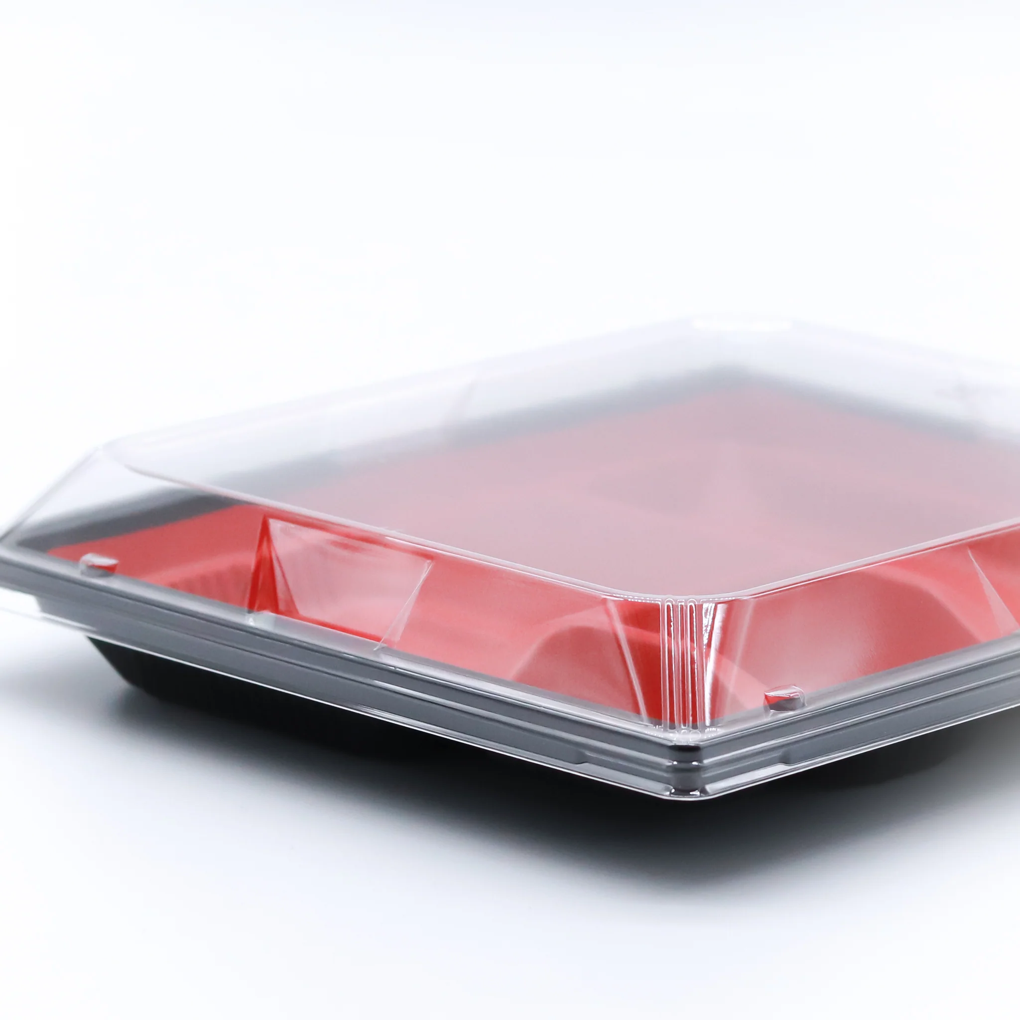 Japanese made, 4 compartment, medium sized, disposable bento boxes. Black with a red interior.